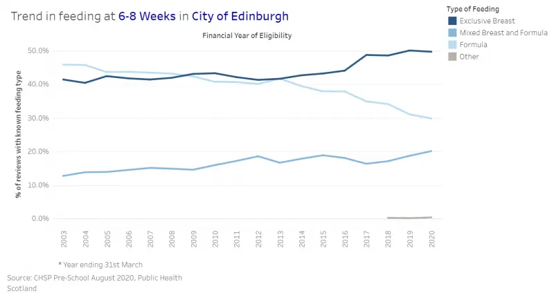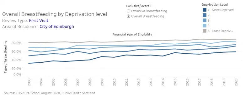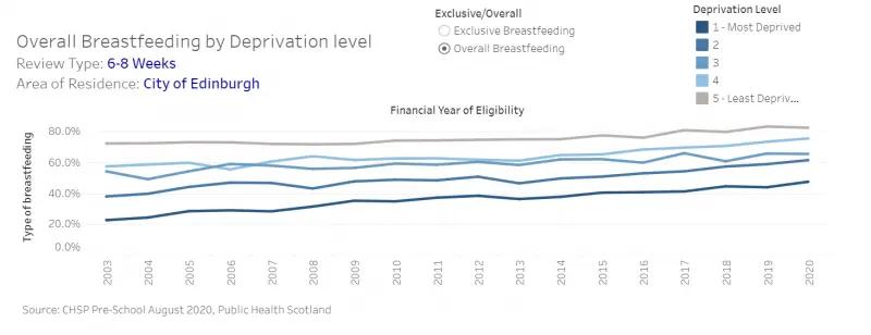 Figure 4: Breastfeeding rates at six to eight week home visit in Edinburgh by SIMD quintile, 2003-2020