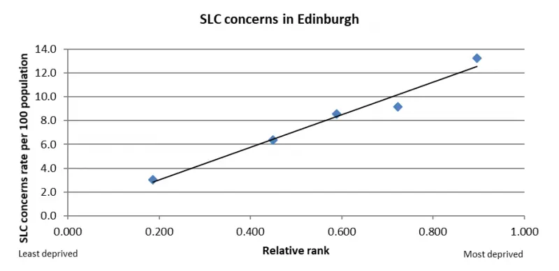 Figure 5: Slope Index of Inequality for speech and language concerns at 27-30 months for children in Edinburgh, 2014-18