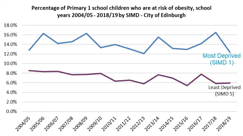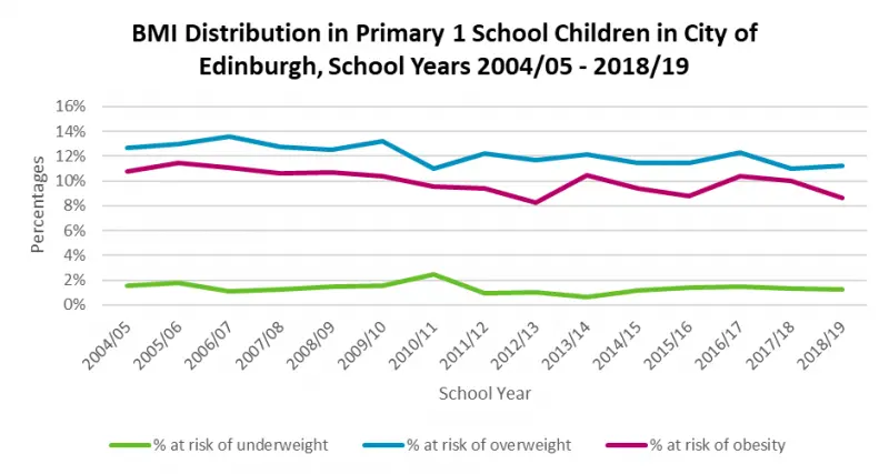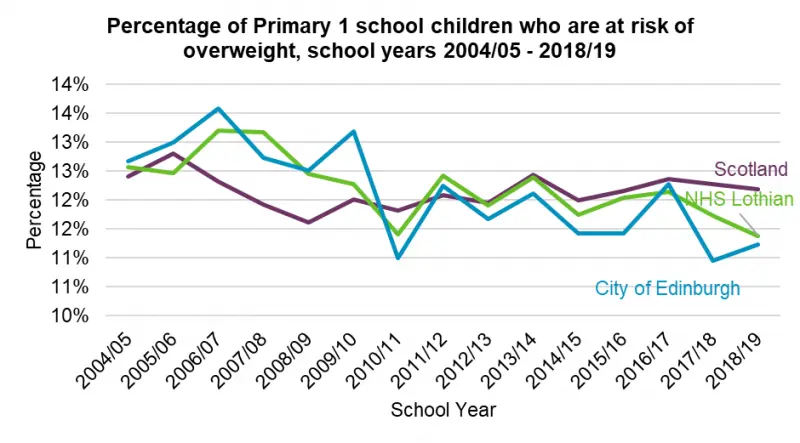In the last ten years, the proportion of children in P1 who are overweight or at risk of obesity has remained broadly consistent at around 11%. However, children living in more deprived communities are consistently more likely to be categorised as at risk of overweight or obesity.