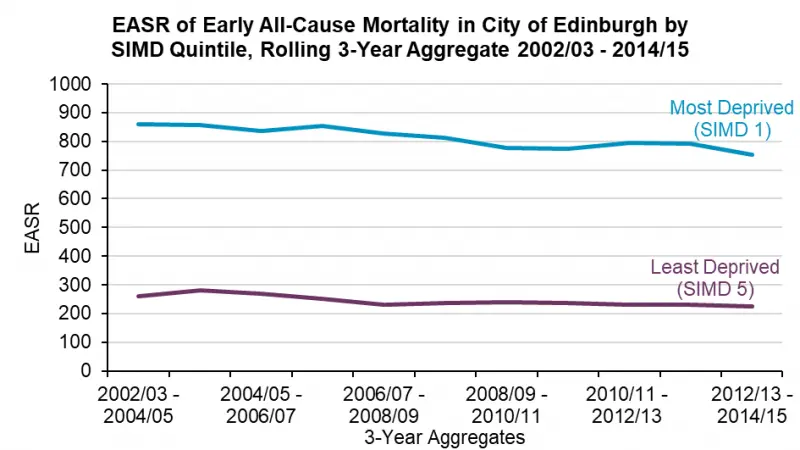 Life expectancy, like most measures of health, is directly correlated to socioeconomic status. More affluent people tend to live longer lives and are more healthy during their lives. There is evidence of pronounced variation in mortality rates in Edinburgh with that trend manifest in the difference between life expectancy in most and least deprived communities: 14 years for males and 10 years for females (see Figure 8).[3]