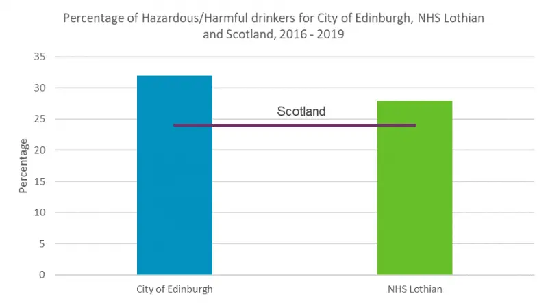 In recent years, the proportion of Edinburgh residents drinking at hazardous rates has been higher than Lothian and Scotland, as shown in figure 19. The graph below shows that the percentage of hazardous drinkers in Edinburgh (32%) is higher than the Scotland (28%) average.
