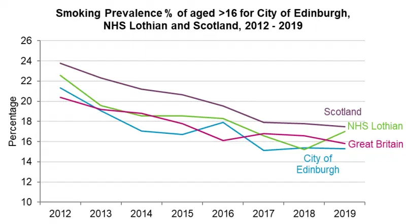The proportion of women smoking during pregnancy is lower in Edinburgh than NHS Lothian and Scotland average. Nevertheless, in 2019/20 8.3% (376) women in Edinburgh smoked during pregnancy. National data also show that women in the most deprived communities in Edinburgh are 139% more likely to smoke during pregnancy than average.