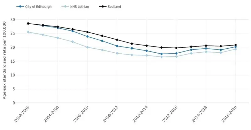Alcohol specific death rates in Edinburgh show a long-term decline; however, they are higher than the Lothian average and have shown a slight uptick in the past ten years. National legislation for minimum unit pricing has contributed to a decline overall in alcohol deaths. But a suite of interventions is still necessary to reduce negative health outcomes associated with alcohol.